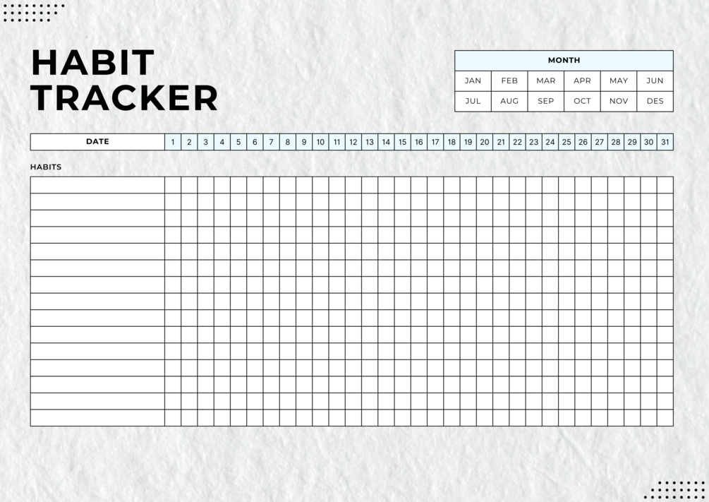 Habit Tracker for 5 habits, 10 habits, and 15 habits for 30 days.