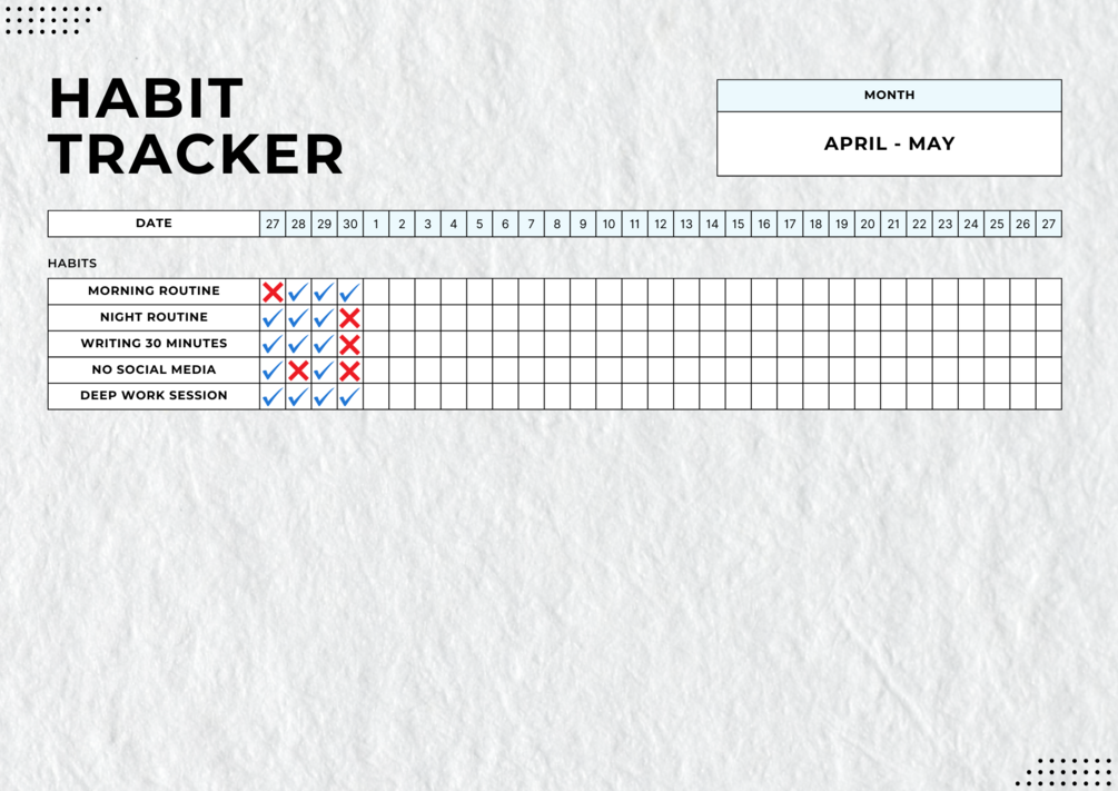 - Write down habits that you want to build or eliminate. For example, a good habit would be to meditate or do a morning routine, and a bad habit would be to avoid social media.
