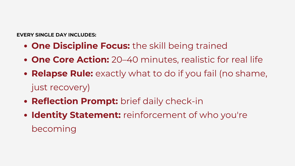 The 30-Day Progressive Discipline Challenge is a structured program that takes you from early momentum to sustainable identity shift.